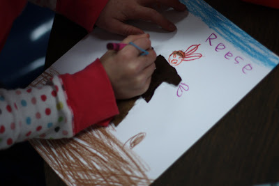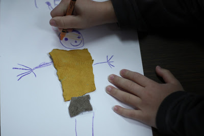 Step Three: Glue the leather clothing piece to paper. Using crayon, add the head, arms, and legs.
