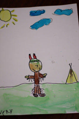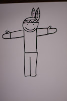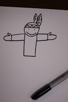 One of my favorite things to do with children is teach them how to draw. I begin by taking them through the process step by step. I use basic shapes and lines. I do one part and then they do it – following my demonstration. While everyone is doing the same drawing – each one turns out very unique and individual. It reinforces shape vocabulary, elements of art, fine motor development and spatial relationships to name a few. This drawing lesson was built around a story I have been telling the class about a Native American boy named Two Feathers.