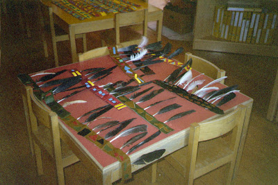 In 2005, I received a Fund for Teachers fellowship to travel to Europe to see early childhood classrooms. I had the delight of spending a few days in a kindergarten in Winterthur, Switzerland. They were studying the Native Americans. Here are a few of their class projects. The teacher had cut out border strips into squares and rectangles for the children to create a Native American pattern.
