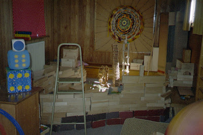 I noticed that the teacher provided several opportunities for weaving and circular weaving. I loved this huge weaving in progress behind the block area: