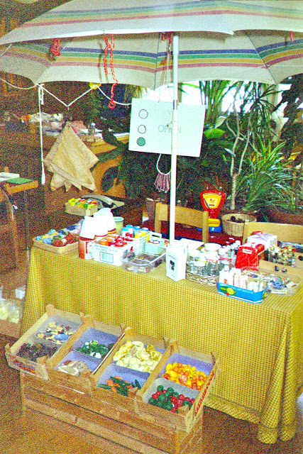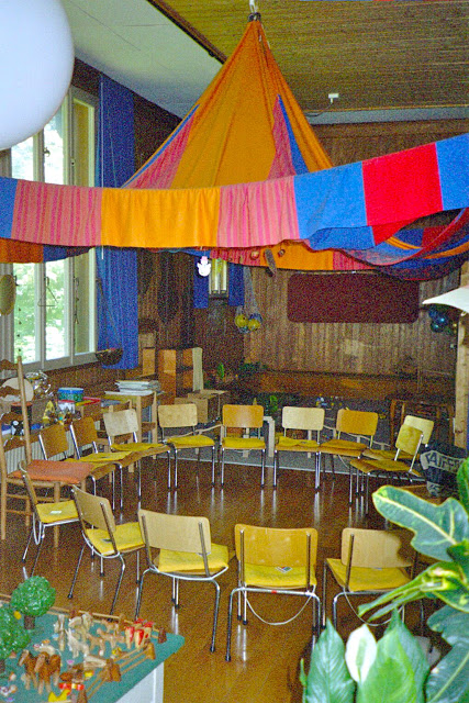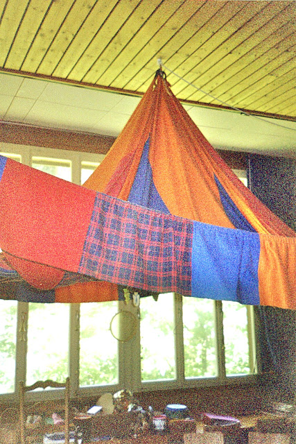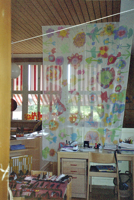 The sheer hanging drape was painted by the children and then used as a room divider. The teacher told me she purchased the drape from IKEA.
