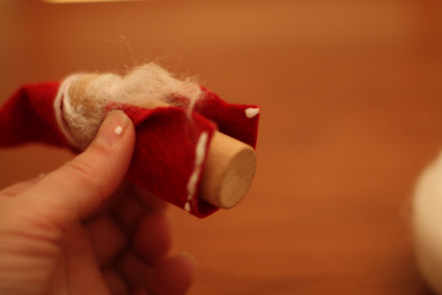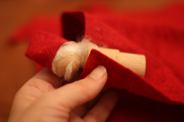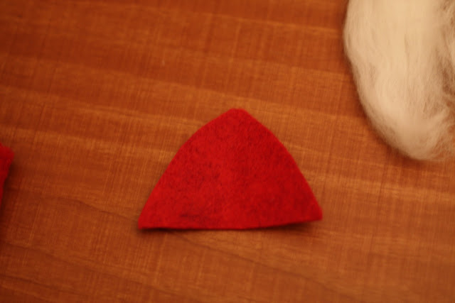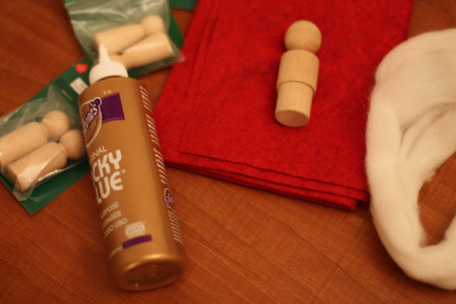 What you will need: wooden bases, red felt, white roving, tacky glue.