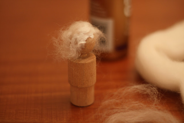 Step Four: Gently put a piece of roving on head. Make sure roving is not too long. Roll a tiny piece of roving to make mustache. Apply with glue.