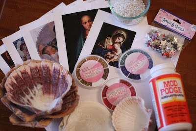 What you will need: a shell (about $2 at Michael's), Mod Podge, Tacky glue, assorted beads, gems and glitter, color copies of Madonna images and little brushes for applying glue and dusting off glitter.