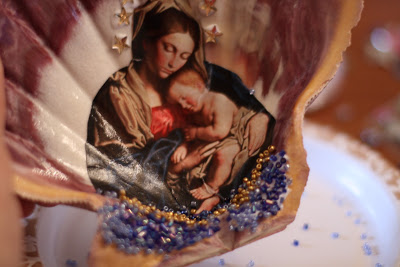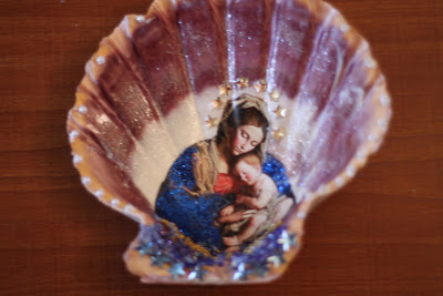Cut out the Madonna image you have chosen. Apply Mod Podge to the back of the image and place on the shell. Apply Mod Podge to front of image and smooth paper to shell.