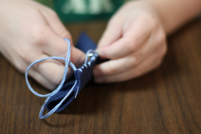 Let each child sew at their own level. Do not demand too much at this point. I like to engage the “love of the task” to build desire for future projects.