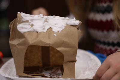 The last step is to paint with snow! To make snow paint – squirt shaving cream into a cup. Squeeze a good dollop of glue into the cup, a small dollop of white paint and stir.