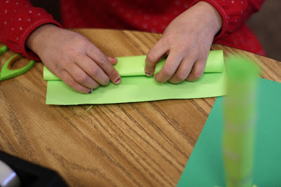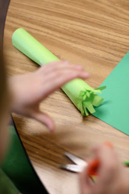 Step One: Roll the bright green paper to form a tube. Secure with tape.