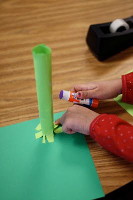 Step Two: Make tabs to glue the tube down. Cut fringe-like cut at the top to give a tree look.