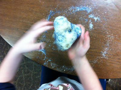 Cook over medium to medium-high heat. Cook until it sticks together (about 3 minutes). Take it out of pan and let it cool. Knead until smooth. Add glitter. I like to sprinkle several different kinds onto the table and let the children knead the glitter into the dough.