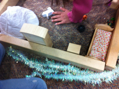 During block play, this group of children used the garland as snow outside their “house.”