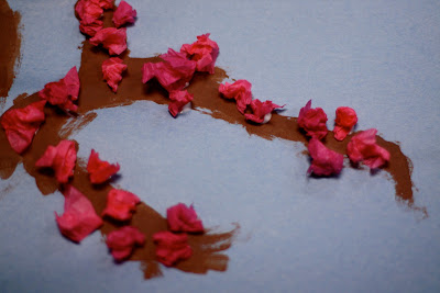 Step Five: Take a pink square of tissue and squish it up so that it forms a little blossom. Place on glue dot. Let dry.