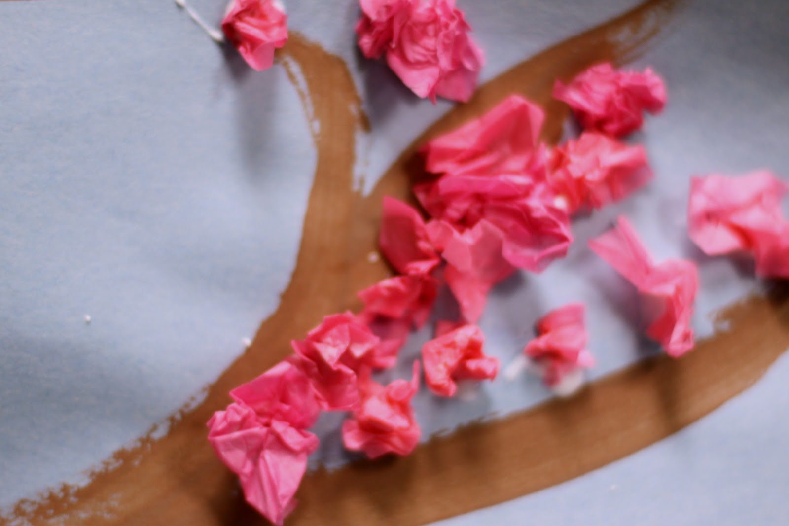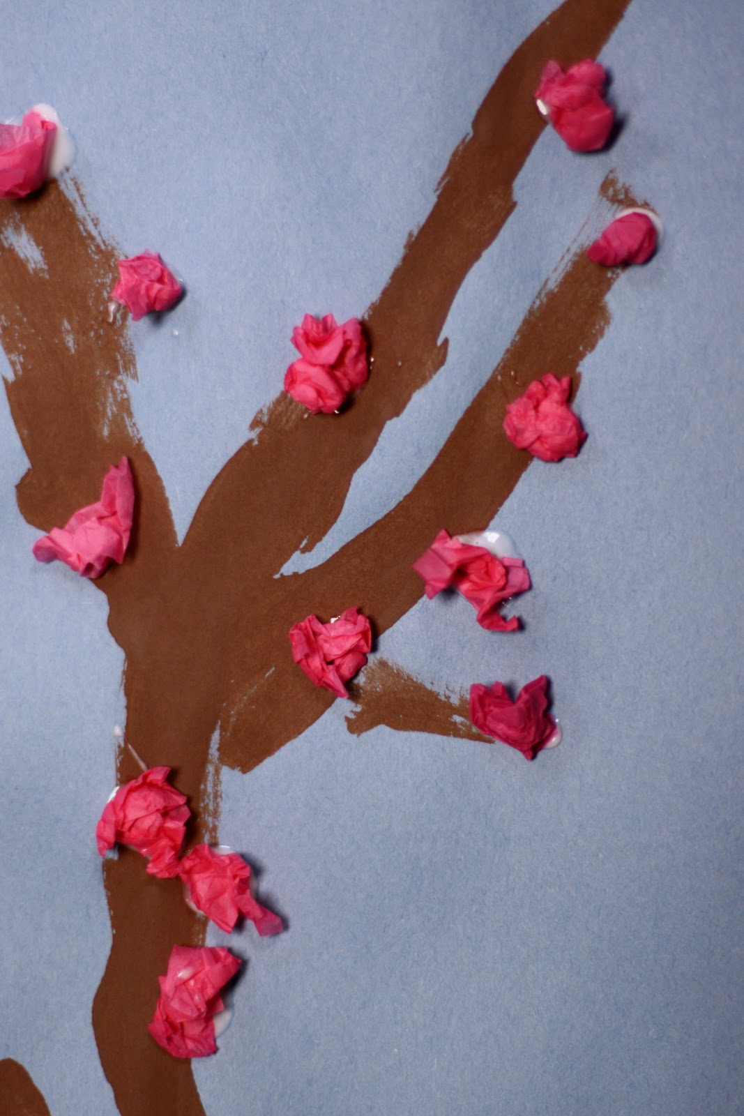 What you will need to paint this tree – light blue construction paper, brown paint, paint brush, glue and pink tissue paper cut into 2 x 2 inch squares.