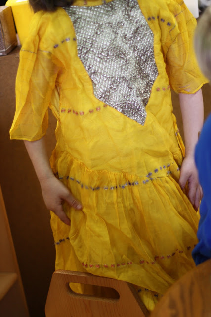 Second, I keep about 5 large boxes with items to put into the housekeeping center when there is not a specific theme to set up. This gives me a large palette of items to choose from and create something special. I also keep several boxes of fabric to put over the top of my playstands. (I love saris for this! Look at your local Indian markets for lovely silk saris – they make amazing covers.)