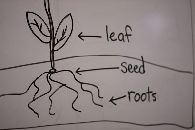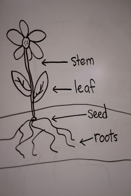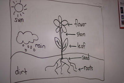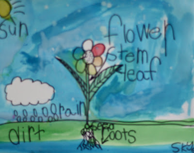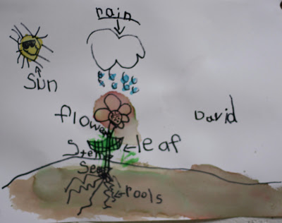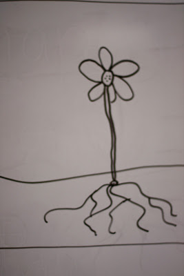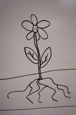 This week we are dwelling in the world of flowers and plants. I told the children I knew a “scientific illustrator” – a person who draws illustrations of nature. We had our own bean plants growing and I took one and displayed the roots, stem, and leaves. I told them we were going to be “scientific illustrators” and draw/label a flower plant. We looked at photographs in books at the parts of real flowers and compared it to our bean plant.