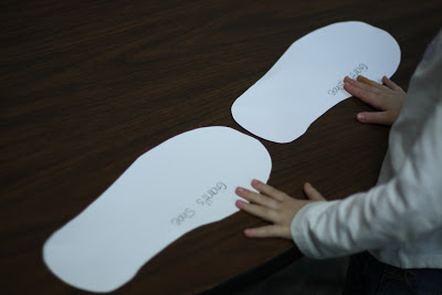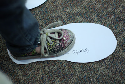I had each child cut out two Giant's shoe prints. They explored the Giant's shoe print by comparing it to their own foot size.