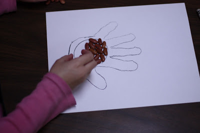 - Next, I asked the students to trace their hands either inside the giant's hand or on the back. They estimated how many beans would fit in their paper hand. They counted the beans and found the answer.