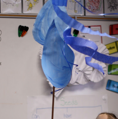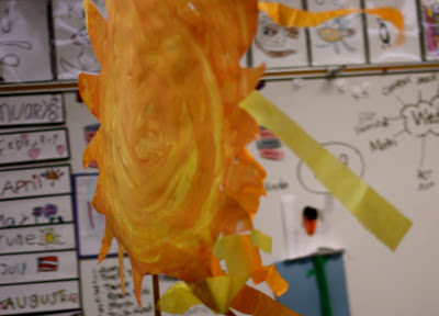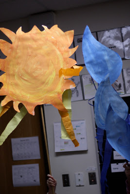I love the beauty of the parade puppets and pageant sticks! This year, for only the second time in my teaching career, I am bringing pageantry to our weather time. First, I talked to the children about what weather sticks we might need – and we went to work painting them. We are not quite finished but I thought I would share what we have done. I used white poster board and tempera paint for the images. I used old flag poles that had been tossed that I had saved from the trash. I used clear packing tape to attach the pole (that way I can recycle it for next year.) Here is a song we will sing as the special helper tells us the weather for the day and picks out the appropriate weather stick.