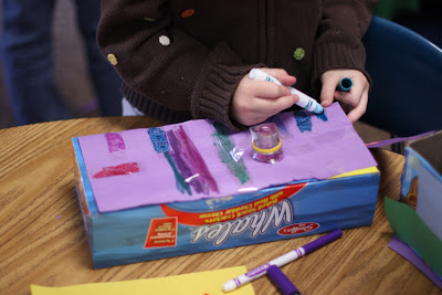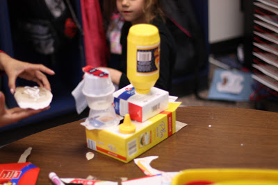 This week I pulled out a huge bag of boxes and containers I have saved for “Creation Station.” I told the children they were to create (invent) something that they can use. (I provided construction paper, glue, scissors, tape) What they created had to have a purpose. The class went to a quiet purr for the first time since Spring Break during the late afternoon – here is a peek at what they created: