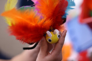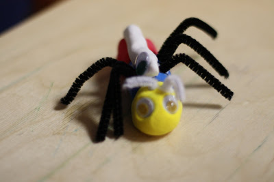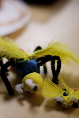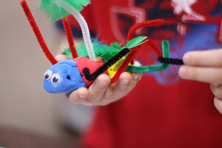 I provide a tray of materials such as googly eyes, pipe cleaners, beads, jewels, and feathers. I tell them that it has to have a head, thorax and abdomen. The rest is up for grabs. After they completed their insect, I had the children write about it. What is your insect called? Where is its habitat?