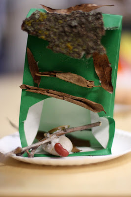 To make the bug's habitat, I purchased small paper bags at Michael's. I prepared the bags by cutting an opening. I had the children glue the bag to a small paper plate. Then they glued on different materials to create a habitat.