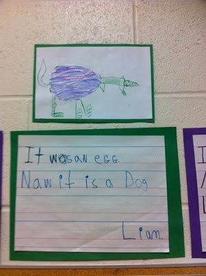 This is a project from Mrs. Goodroe's kindergarten across the hall from me. Each student is given an egg cut out to transform. They then wrote the sentence, “It was an egg, now it is a . . .”. I thought they turned out so lovely!