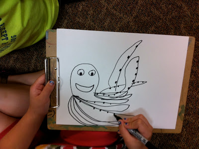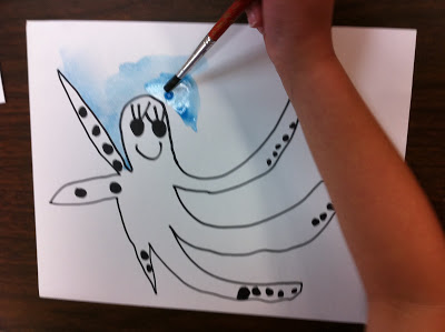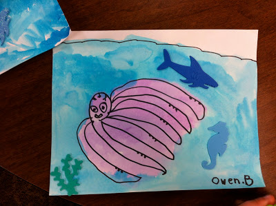 What you need: white cardstock, sharpies, watercolor, foam sea creature stickers