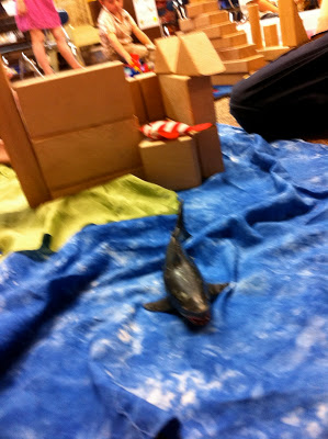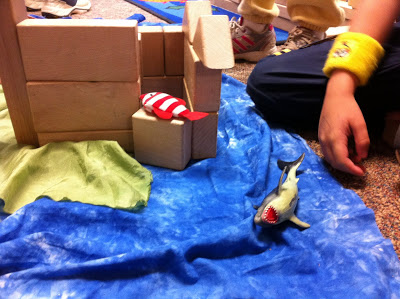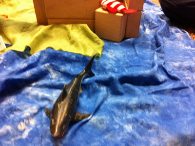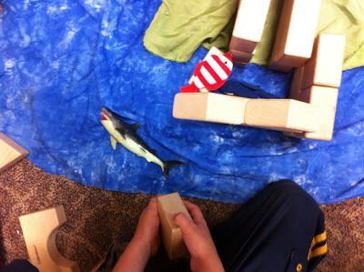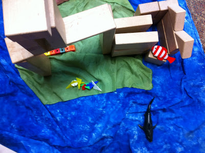 This week the children reminded me of the incredible value of providing materials for block play. With each change of theme – I like to put out new cloth and items related to our stories. I put out blue fabric for water, green for earth and brown as well. I had an assortment of sea creatures that I added.