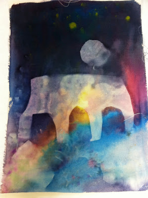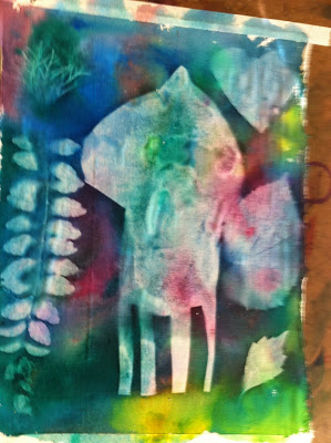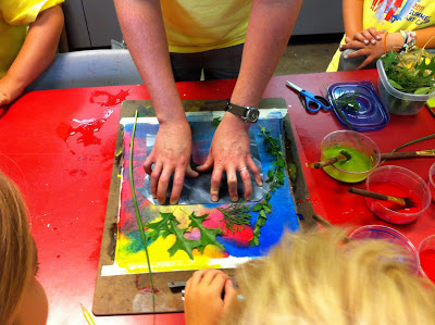 Michelle, the art teacher next to me at the museum, did the coolest project! Oh my! Did you know there is sun paint? Just like the sun print paper! What you will need: muslin fabric cut to size, the cool sun print fabric paints (click here for source), cut-outs and found objects to put down for printing. Here is what she did: