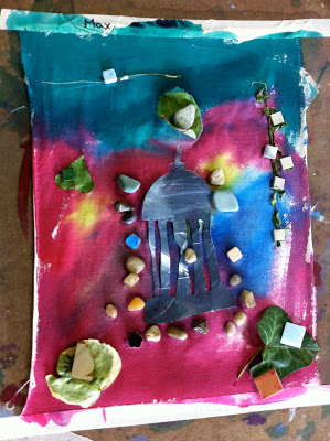 Michelle, the art teacher next to me at the museum, did the coolest project!  Oh my!  Did you know there is sun paint?  Just like the sun print paper!  What you will need:  muslin fabric cut to size, the cool sun print fabric paints (click here for source), cut-outs and found objects to put down for printing. Here is what she did: