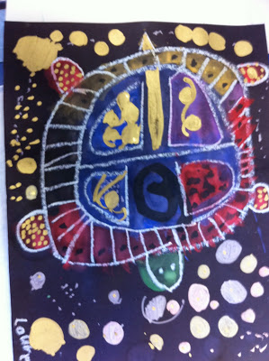 This is so easy and turns out so lovely. It is a guided drawing using white oil pastels and then painted with tempera paints. The last step uses a metallic paint pen.