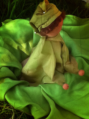 I tell the story sitting down in Story Time. I drape a cloth over my lap to create a little stage with some of the fabric lying in front of me. I set up the characters and use small pieces of fabrics, wood, and other found items to create the sequence of the scenes. (I also use a small table.) Example: for The Three Billy Goats – I use a large blue fabric for the river, a brown piece of cloth for where there is no grass, a piece of green fabric for the tasty green grass and a large block for the bridge. This is not only cheap but gives the children the feeling they have entered the story world.