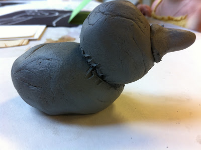 Attach the head by scoring the both sides with a plastic fork.  Add slip (which is watered down clay – this is like glue that will attach the two pieces.)