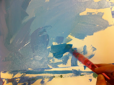 STEP ONE: Mix up several mixtures of blue for the pond. Remember to have one a bit on the purple side or pinkish.