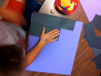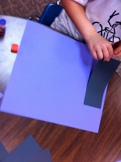 STEP ONE: Glue down the black rectangles onto the purple paper.