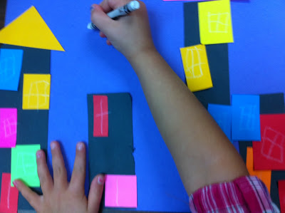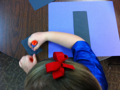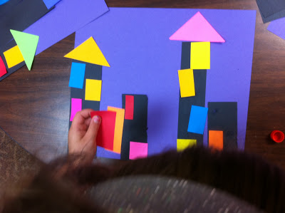 Purple, black and assorted colored construction paper. I prepared the paper by cutting the black paper into various sizes of rectangle for the skyscrapers. I cut the colored paper into assorted sizes of squares and triangles.
