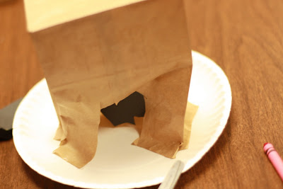 Step One: Cut down the brown lunch bag. Cut “tabs” in the corners. Fold back and glue down on paper plate.