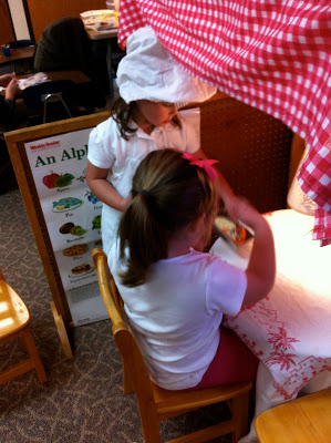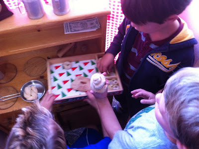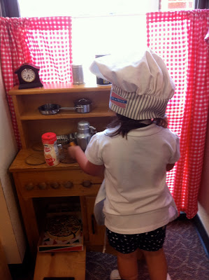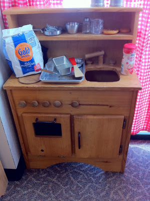 I stock the center with lots of baking tools, containers of baking ingredients, the pretend bread items the children made, and more.