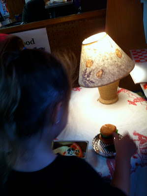 I love to use the bright red and white gingham print for the playstands and in the window.  I have this sweet table cloth I found at a garage sale that has red needle work for the table.