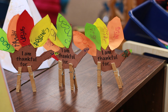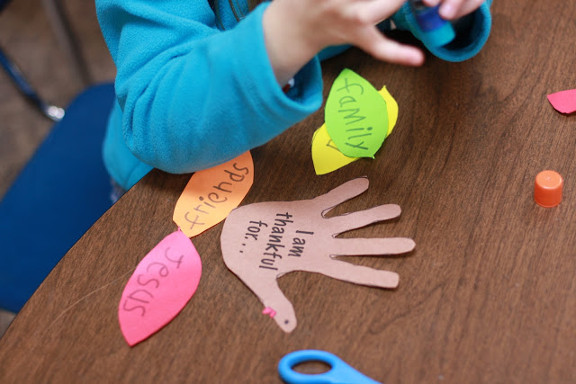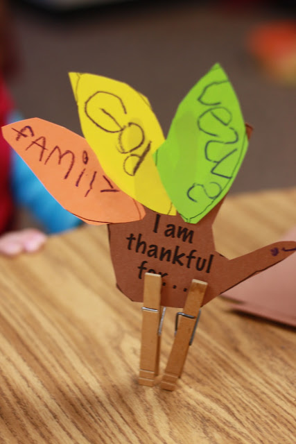 This is a quick and easy project. I wanted something the children could take home and put out to share what they are thankful for. I made two simple black lines and then copied them on colored paper. Simple.