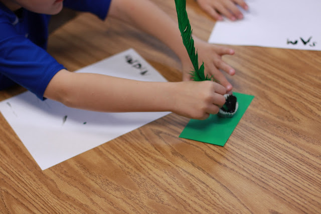I purchased a package of 25 turkey feathers at Michaels for just $4.99 plus discount coupon. This week the children wrote with the quill feathers. Yesterday, I let them take them home.