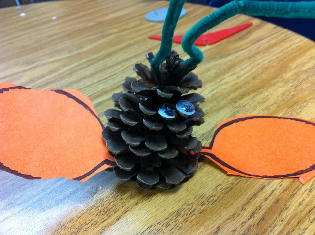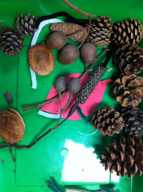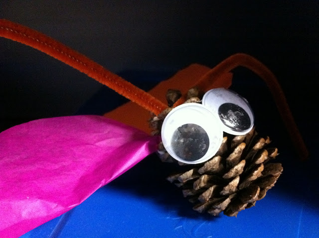 What you will need: nature items such as pine cones, pods and small sticks, pipe cleaners, googly eyes, tissue paper, construction paper (I printed leaves on my paper as our fall did not produce much in colored leaves), artist's heavy gel medium.
