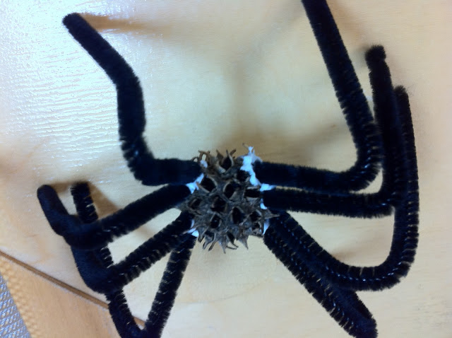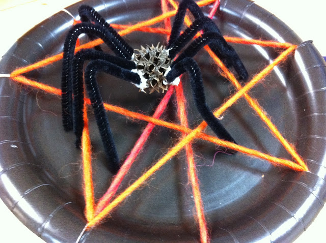 This is an easy peasy spider to make. I discuss the difference between a spider and an insect. The children count out 8 legs for their spider. Additionally, we discuss how many eyes a spider has – (between 4-8 eyes). What you will need: sweet gum balls, black pipe cleaners, googly eyes and artist's heavy gel medium (thick paste to use as glue). For the web you will need: a paper plate and yarn.
