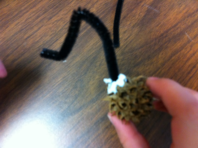 Step One: Each child gets eight pipe cleaner legs (pipe cleaner cut in a half), a sweet gum ball and a bit of heavy gel medium to dip the pipe cleaner into.