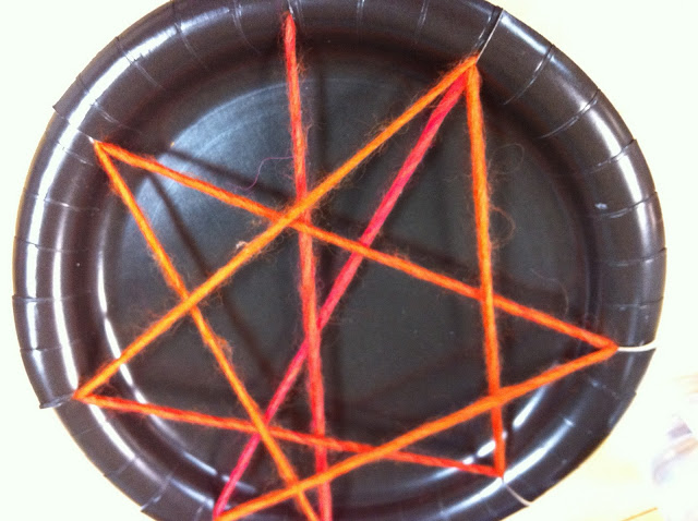 Making the web: Prepare the paper plates by cutting slits around the edge and cutting yarn. I tape the yarn to the back of the paper plate with a piece of masking tape.