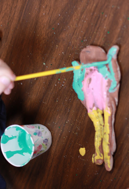 I give each child a handful of dough to form as they wish. After the dough is baked, then it is time to paint and decorate the “cookies.”