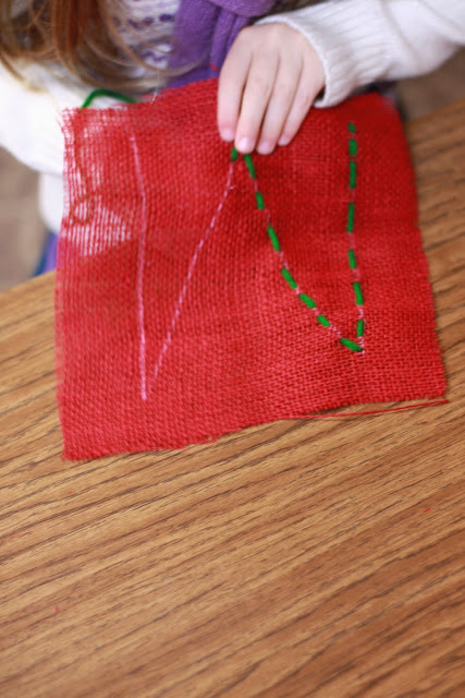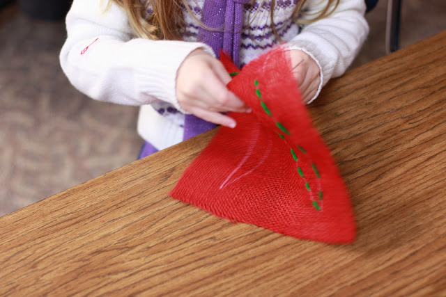 Normally, I introduce hand sewing during my pilgrim unit. This year we did not have time to get to it. So I introduced it as a part of the elves unit. The elves in the story sew the leather of the shoes. We sing a song of how the needles go “in and out.”