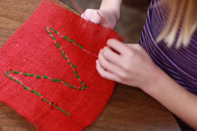 Materials needed: burlap, blunt needles, white paint pen, yarn.
