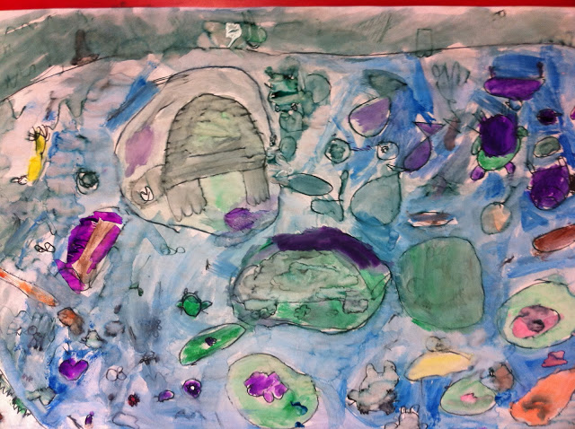 Me oh my! I saw the coolest idea ever! Lacy Williams, an intern in the classroom next me, had the children in her class doing a collaborative scientific art piece. I was so blown away by the wisdom of how she lead the up to the collaborative piece. The topic was pond life. Here's what she did:
