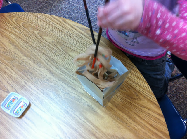 I loved the felt noodle idea so much! I put out pieces of felt and let the children cut noodles. They loved it! Noodle Shop is open!